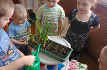 Балалар белән көн саен карап торып суган һәм укроп үстерәбез. Балалар хәттә суганны күзәтеп кенә түгел, иснәптә торалар.