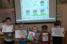 Рәсем эшчәнлегендә балалар белән туган як, туган ил турында әңгәмә кордык һәм үзләренең яшәгән өйләрен рәсемгә төшерделәр.