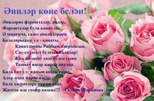 Әнием, бәйрәмең котлы булсын, кояш гел елмаеп, гел көлеп торсын! Әнием, кадерлем, шатлан, көл, син, җыр булсын бүләгем гөлләргә тиң!