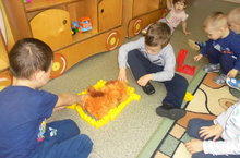 Аю дуска, Көз кызы, балаларга дип, көз күчтәнәчләре җибәргән икән. Нәниләр сөенделәр, җиләк-җимешләрне, яшелчәләрне тотып апайларына кушылып "Көз һәм балалар" җырын җырладылар. Аю дускай белән "Поезд" уенын да уйнадылар, бик күңелле булды. Аюны әнисе янына озаттылар, тагын кунакка чакырып калдылар.