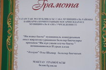 "Иң яхшы бакча" муниципаль конкурсының авыл җирлегенә урнашкан балалар бакчалары арасында "Иң күп уңыш алучы бакча" номинациясендә 2 урынны алып грамота белән бүләкләндек.