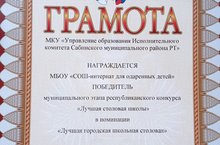 Наша школа стала победителем муниципального этапа республиканского конкурса "Лучшая столовая школы" в номинации "Лучшая городская школьная столовая". Молодцы!