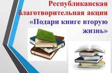 Внимание! Наша школа участвует в Республиканской благотворительной акции «Подари книге вторую жизнь» Если у Вас есть дома прочитанные книги – учебники в хорошем состоянии, художественная, научно-популярная, справочная литература – Вы можете подарить их школе!