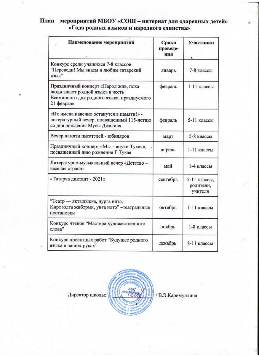 План мероприятий МБОУ «СОШ – интернат для одаренных детей» «Года родных языков и народного единства» -