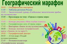 Изучать географию мы с вами привыкли по строгим школьным учебникам, атласам, энциклопедическим изданиям. Всегда ли о географии можно говорить только на уроках географии? Нет. В целях расширение кругозора учащихся и развития познавательного интереса к изучению географии, воспитания развитого сознания, умственной культуры и дружественного отношения друг к другу в нашей школе будет проходить географический марафон. С 10 марта по 21 марта учащиеся нашей школы – докажут всем, что география – это всепроникающая наука, ну и, конечно же, проверят - насколько обширны их знания по географии.