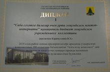 Мәктәбебез 2018 елда район оешма-предприятиеләре арасында уздырылган комсомолның 100 еллыгына багышланган “Алга атла, комсомол” дип исемләнгән иҗат-отчет концертларында катнашып беренче урын яулаганы өчен диплом белән бүләкләнде. Әлеге концертта катнашкан һәрбер хезмәттәшебезгә чын күңелдән рәхмәт әйтәбез, киләчәктә дә иҗади уңышлар һәм җиңүләр телибез.