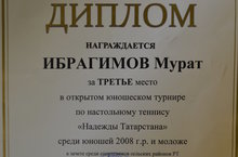 Ученик 3 класса Ибрагимов Мурат занял 3 место в открытом юношеском турниру по настольному теннису “Надежды Татарстана” среди юношей 2008 г.р. и моложе. Поздравляем Мурата с победой и желаем дальнейших спортивных достижений!
