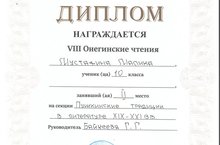 1 февраля в Зеленодольске состоялись VIII Онегинские чтения. В 2018 году Онегинские чтения были посвящены подвигу декабристов. Мустафина Малика,ученица 10 класса представила работу на тему "Он все отечество возносит..." на секции "Пушкинские традиции в литературе XIX-XXI в.в. и заняла 2 место.Благодарим Байкееву Гульнур Габделгазизовну за хорошую подготовку ученицы.Желаем дальнейших успехов!