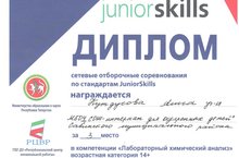 Дан старт сетевым отборочным соревнованиям по стандартам Junior Skills. Юные инженеры и химики, программисты и кровельщики, техники и создатели роботов встретятся на площадке JuniorSkills. Стартовыми компетенциями для команд Сабинского муниципального района стали "Лабораторный химический анализ" и "Электроника". По итогам первых соревнований ученица 10 класса нашей школы Кутдусова Алиса заняла 3 место в компетенции "Лабораторный химический анализ" (возрастная категория 14+). Выражаем благодарность учителю химии Хазиевой Альфире Рифкатовне за хорошую подготовку ученицы.