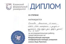 2 ноября 2017 года учащиеся нашей школы Ахтямов Ренат, Осипова Ангелина, Мустафина Малика приняли участие в Всероссийской научной конференции-конкурсе учащихся имени Льва Толстого, организованной Институтом филологии и межкультурной коммуникации им. Льва Толстого Казанского федерального университета.