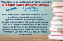 С целью пополнения фонда школьной библиотеки учебной, научно-популярной, художественной, справочной литературой, с 16 сентября по 31 октября в нашей школе проводится ежегодная республиканская благотворительная акция "Подари книге вторую жизнь". В акции могут участвовать школьники, их родители и все желающие жители Татарстана, в том числе организации. Участие в акции осуществляется на добровольной основе.