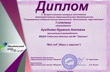 Музыкальный руководитель нашего детского сада "Шатлык" Аухадиева Н.А. приняла участие в V Всероссийском конкурсе конспектов "Современные педогогические технологии: достижений переспективы" и была награждена Дипломом I степени.