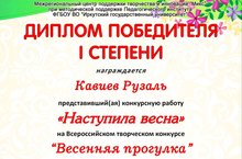 Конкурс "Весенняя прогулка" 22.04.2017 Россия күләм иҗади конкурсларда тәрбиячеләребез, тәрбияләнүче балаларыбыз да даими катнашып киләләр. Икенче кечкенәләр төркеменнән Кавиев Рүзәл "Язгы саф һавада" конкурсында кисеп ябыштыру номинациясендә катнашып беренче урынны яулады һәм беренче дәрәҗәде Диплом белән бүләкләнде. Тәрбияче Әнисә Әминовнаны, Кавиев Рүзәлне җиңүләре белән котлыйбыз, иҗади уңышлар теләп калабыз.
