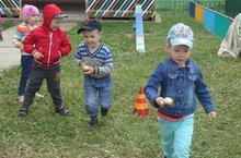Икенче кечкенәләр төркеме балалары тәрбияче Гүзәл Хәмзевна белән берлектә "Минем яңгырвакылы, күңелле тубым" уены вактытында тупны сикертеп, тәгәрәтеп булуын күзәттеләр. Туп кебек үзләре дә сикерә һәм бер юнәлештә таралып йөгерә белүләрен күрсәттеләр.