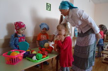 Бүген икенче кечкенәләр төркеме балалары белән берлектә тәрбияче Гайфуллина Дания Әминовна яшь педагогларга "Уйный-уйный үсәбез" темасы астында ачык чара күрсәтте. Балаларның уенын оештыру, рольләрне бүлешеп үзара дус-тату аралашып уйнарга күнектерү, профессияләр белән тирәнтен таныштыру, мөстәкыйльлелек, уенчыкларга сак караш тәрбияләү максатыннан оештырган эшчәнлек барышынды балалар бик актив булдылар. "Гаилә", "Төзелеш", "Балалар бакчасы", "Кибет", "Матурлык салоны" уен үзәкләрендә балалар рольләргә кереп уйный белүләрен, төзүче, тәрбияче, сатучы, чәчтараш һөнәрләре белән таныш булуларын күрсәттеләр.