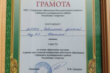 Саба муниципаль районы педагогик хезмәткәрләренең август киңәшмәсендә оештырылган күргәзмәдә МБМБУ Саба 1 нче "Шатлык" балалар бакчасы 3 урынны яулады һәм Грамота белән бүләкләнде.