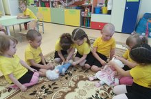 Бүген икенче кечкенәләр төркеме балалары курчакларга кышкы киемнәрне дөрес эзлеклелектә киендерергә өйрәнделәр.Кышкы киемнәрнең билгеләнешен, төсен, , материалларнын,детальләрен аерып алып, аларны карарга һәм исемне сыйфат белән туры китереп әйтергә тырыштылар. Тукыма, мех, йомшак, җылы, ак, яшел сүзләре хисабына сүзлекләре арттыру өстендә эш алып барылды. Шөгыль бик кызыклы рәвештә үтте. (Сайфутдинова Г.З.).