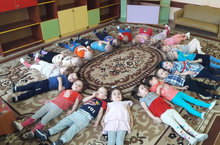 1 нче кечкенәләр төркеме балалары тыныч музыка астында, идәнгә ятып ял итәргә яраталар.