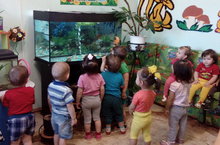 Ясле төркеме балалары табигать бүлмәсенә кунакка килделәр. Монда алар аквариумдагы балыкларны, ташбакаларны карадылар. Аларга барысы да бик кызыклы булды. Ташбакаларны алар куллары белән тотып карадылар. Табигать бүлмәсеннән аларның китәселәре килмәде, чөнки монда аларга барысы да яңа иде.