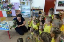 "Китап киңәшчең синең" атна темасына багышлап,бүген 2 чне кечкенәләр төркеменә китапханәче Алия апа килде. Ул китапханәдән бик куп төрле,кызыклы,матур китаплар алып килде. Балалар бик кызыксынып тыңладылар.