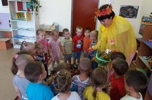 Буген 2 нче кечкенәләр төркеме балалары янына Көз килде. Ул буш кул белән килмәгән,кәрзин белән көзге муллык алып килгән. Балалар бик шатланышып көзне каршы алдылар,аның белән төрле уеннар уйнадылар. Кучтәнәчләре белән сыйландылар.