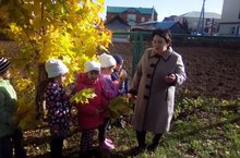 Сегодня на прогулке воспитатель по обучению русскому языку Мавлявиева Л.А с детьми подготовительной к школе группы наблюдали за деревьями. Воспитатель обратила внимание детей на красоту осенних листьев, что у разных деревьев они окрашиваются по-разному: ярко-жёлтые, оранжевые, тёмно-красные Дети, посмотрели, как красиво кружатся листья в воздухе. В конце наблюдения дети собрали осенние букеты из желтых листьев и с удовольствием играли игру «Осенние листочки».