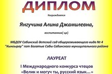 Воспитанница подготовительной группы Янгучина Алина стала лауреатом I Международного конкурса чтецов "Велик и могуч ты, русский язык..." . За выразительное рассказывание наизусть сказки А.С.Пушкина "У лукоморья дуб зеленый Алина награждена дипломом. Мы поздравляем ее и желаем успехов в учебе!