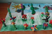 Бу атнада бакчабызда язучыларыбыз иҗаты белән таныштык. Язучылар (А.Алиш, Р.Миңнуллин һ.б.) әсәрләренә кызыксыну уяту, аларның әкиятләре, хикәяләре, шигырьләре аша балаларда уңай, әхлакый сыйфатлар тәрбияләү максат итеп алынган иде. Бүген мәктәпкә әзерлек төркеме балалары (Тәрбияче Шамсутдинова Л.М) әвәләү шөгылендә Р. Миңнуллинның “Май килә” дип исемләнгән шигырен укыдылар. Аннары шигырь эчтәлеге буенча май чәчәкләрен пластилиннан әвәләдек. Чәчәкнең сабагын мамык таякчыгын яшел пластилиннан төреп ясадылар. Болай итеп эшләү балаларга бик ошады.