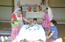 Урамда оештырган татар өендә әбиләребез яратып чиккән сөлгеләр, эскәтерләр, бик күп төрле чиккән япмалар, татар халык ризыклары белән балаларны каршыладык.