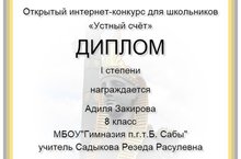Ученики нашей гимназии участвуют в различных дистанционных конкурсах и олимпиадах всероссийского, регионального и муниципального масштаба. В этом учебном году ученица 8б класса Закирова Адиля участвовала в конкурсе «Устный счет» и стала победителем , заняв 1 место. Ученица 6б класса Закирзянова Галия награждена сертификатом участника.