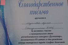 Итоги конкурса "Дулкыннар" 02.02.2018 Объявлены итоги муниципального этапа республиканского конкурса "Дулкыннар", посвященного 85-летию певицы татарского народа Альфии Авзаловой. Наша участница Муратова Аделина была награждена Благодарственным письмом в номинации "ИЗО".