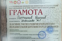 Ученик 6 класа Постников Ярослав занял II место в республиканской краеведческой конференции исследовательских работ школьников по истории родного края и культуре кряшен "Ыру агачы"