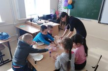 Занятия с дошколятами 28.03.2019 В школе проходят еженедельные занятия для будущих первокласников. Они проходят согласно графику работы с дошкольниками. Будущие ученики школы весело и с пользой проводят время. Сегодня учитель начальных классов Камалова Д.Р. занималась с детьми творческим прикладным делом.