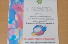 "Бравые кадеты" 14.03.2019 Команде школы "Бравые кадеты" за активное участие в зональном этапе лиги КВШ среди образовательных учреждений района была вручена грамота. Руководитель- Мухаметзянова Р.Х.