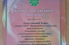 "Замечательный вожатый" 13.03.2019 Сегодня прошел муниципальный этап республиканского конкурса "Замечательный вожатый-2019". Нашу школу представляла Ахметзакирова Алиса из 5а класса. Алисе вручено благодарственное письмо за активное участие. Руководитель- Мухаметзянова Р.Х.