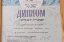 Лауреат всероссийского фестиваль-конкурса "Наследие России" 14.03.2019 В Казани прошел республиканский этап всероссийского фестиваль-конкурса детского, юношеского и взрослого творчества "Наследие России". Мухаметшина Сююмбикя стала лауреатом 3 степени в младшей группе игрой на фортепиано. Молодец!!! Мы поздравляем Сююмбикю и желаем ей дальнейших успехов и побед!