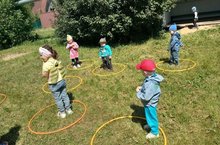 В младшей группе прошла подвижная игра "Пчелки", целью которой учить детей свободно бегать и перешагивать обруч.