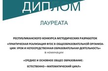 С 1 октября по 4 декабря проходил Республиканский конкурс методических разработок конспектов уроков и непосредственно образовательной деятельности "Практическая реализация федеральных государственных образовательных стандартов в общеобразовательной организации: урок и непосредственная образовательная деятельность". В данном конкурсе приняли участие наши учителя. Учитель математики Фахрутдинова С. А. стала лауреатом и награждена дипломом, учитель русского языка Иванова Э. Х. награждена сертификатом участника.