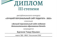 С сентября по ноябрь текущего учебного года прошёл республиканский конкурс "Лучший персональный сайт педагога-2022". В номинации "Лучший персональный сайт педагога дополнительного образования детей" на руководитель кружка "Робототехника" Бурганов Т. Ю. занял 3-е призовое место. Поздравляем!