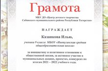 Спикер ДШД "Факел", ученик 9 класса, Казанков Илья награждён Грамотой за инициативу и позитивное отношение к общественной жизни, за активное участие в муниципальных акциях, проектах, конкурсах по итогам 2021-2022 учебного года.