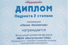 Ансамбль "Шундыос" принял участие в Республиканском конкурсе удмуртской культуры "Мудорвай" ("Росточек") в номинации "Песня. Коллектив" и награждён Дипломом Лауреата 2 степени.