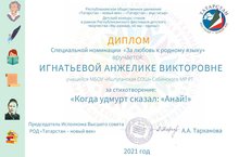 Учащиеся МБОУ «Иштуганская СОШ» приняли участие в творческом конкурсе стихотворений в рамках Республиканского фестиваля детского творчества «Мы разные, но мы – едины!». Ученица 7 класса Игнатьева Анжелика награждена дипломом в специальной номинации «За любовь к родному языку» за стихотворение «Когда удмурт сказал: «Анай!».