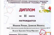 Ученики 6 класса Иванов Роман и Денисов Никита приняли участие в Республиканском конкурсе технического творчества и современных технологий "ТехноФест - 2020". В номинации "Робототехника" заняли 2 место и награждены Дипломом (рук. Бурганов Т. Ю.)