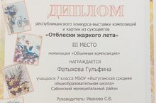 На базе МАУДО «Детский эколого-биологический центр №4» г. Набережные Челны прошёл республиканский конкурс-выставка композиций и картин из сухоцветов «Отблески жаркого лета». Ученица 7 класса Фатыхова Гульфина предоставила работу на конкурс-выставку и награждена Дипломом за 3 место в номинации «Объёмная композиция». Руководитель Иванова С. В.