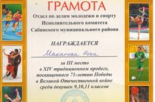 Поздравляем Макарову Розу, ученицу 11 класса, которая приняла участие в XIV традиционном пробеге в 12 км, посвящённого 71- летию Победы в Великой Отечественной войне среди девушек 9,10,11 классов и заняла III призовое место. Молодец Роза, желаем Тебе успехов в учёбе и дальнейших побед!
