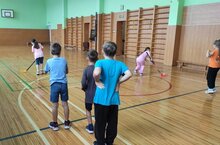 Восемнадцатый день лагеря "Лесная поляна" традиционно начался с линейки и утренней зарядки. После вкусного завтрака в спортзале прошли соревнования «Весёлые старты».