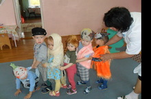 Кечкенәләр төркемендә әкиятләрне менә шул рәвешле сәхнәләштереп уйныйлар. Эчтәлекләрен яхшылап өйрәнәләр, ахырдан нәтиҗәләр ясыйлар. Балалар бик теләп, ярышып рольләрне бүлешәләр. Әле генә телләре ачылып килгән сабыйлар рольгә кереп тырышып-тырышып сүзләрне әйтеп аңлаталар.