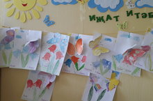 Пластилиннан зурлар төркеменә йөрүче балалар матур итеп, җәй бизәге булган, төрле төсле күбәләкләр ясадылар.