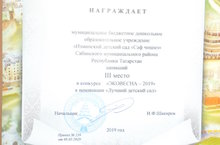 Район күләмендә үткәрелгән "ЭКОВЕСНА - 2019" конкурсының "Лучший детский сад" номинациясендә катнашып, бакчабыз III урынга лаек булды. Бу безнең барыбызның - тәрбиячеләр, балалар, әти-әниләрнең тырышлыгы нәтиҗәсе.