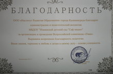 Калиниград шәһәренең "Белем үстерү институт"ы администрациясе һәм педагогик коллективы Эзмә "Саф чишмә" балалар бакчасының педагогларына, Бөтенроссия "Умка" олимпиадасында катнашып урыннар алган өчен, рәхмәт хаты җибәрде.